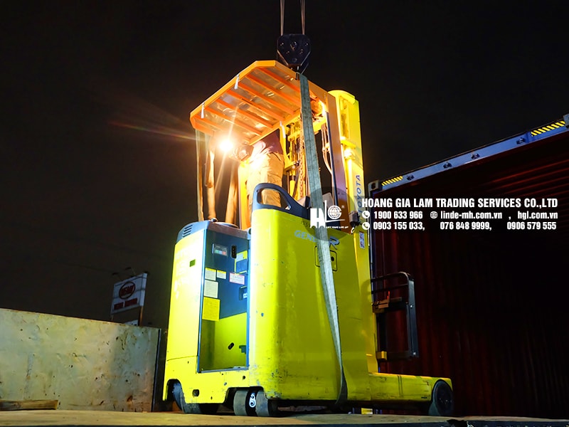 Dòng xe nâng reach truck đứng lái và xe nâng điện ngồi lái lại được Công Ty TNHH MTV TM DV Hoàng Gia Lâm (HGL) nhập khẩu từ Nhật về Việt Nam. Container bao gồm các xe nâng reach hiệu Toyota, Unicarriers và Nissan với tải trọng nâng từ 1.3 tấn đến 2.5 tấn.